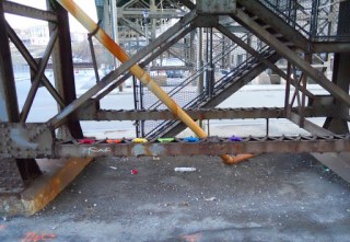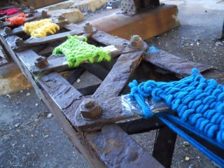 In preparation for my final thesis exhibition, I wanted to revisit the Marsupial Bridge by my house do a colour theory piece. I ideally wanted all 12 primary, secondary, & tertiary colours weaved, but it was February. And although it was a warmish day (about 10°C or 50°F), and I had the dog with me to enjoy the non-sunlight & his fake-walk under the bridge, I ended up getting too cold. So 6 colours, a rainbow, is what I ended up with- and I like it.